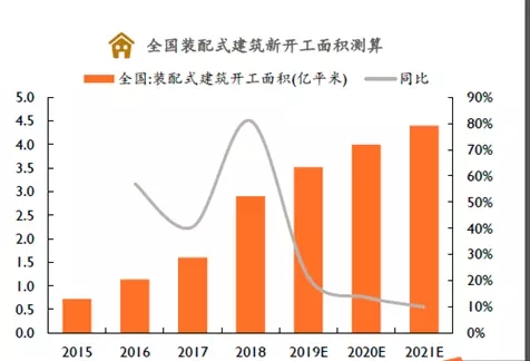 3、未来我国装配式建筑市场规模可达万亿元受益国家政策推动,2018年我国装配式建筑新开工面积达2.9亿平方米,同比增长81%(占新开工面积13.9%),中性预测下,我们预计2019~2021年国内新开工房屋面积为20.1亿平米、19.5亿平米、19.1亿平米,假设装配式建筑占比为17.5%、20.5%、23%,对应装配式建筑新开工面积分别为3.5亿平米、4.0亿平米和4.4亿平米,按每平方米造价2300元计算,2019~2021年我国装配式建筑市场规模分别可达8000亿元、9200亿元和10000亿元(建筑整体建安工程造价,含非装配式建筑部分)。