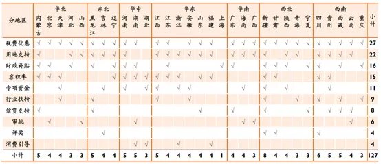 从内容看,各省市装配式支持政策类型主要包括:用地支持、财政补贴、专项资金、税费优惠、容积率、评奖、信贷支持、审批、消费引导、行业扶持等10个小类。