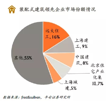 2、从企业看,国资建筑大佬占据市场从施工企业看,由于装配式建筑并无特殊资质要求,具备建筑工程施工总承包资质(数量庞大)的建工企业均可承接相关建设工程,其中中国建筑、上海建工等经营市场位于东部发达地区的龙头企业优先受益。2017年,按PC装配式建筑构件收入计,远大住工是中国PC装配式建筑构件市场的最大参与者,市场份额达到15.9%。市场竞争对手包括大型国有建筑企业、地方构件制造企业和合资构件制造企业。其他主要参与者包括上海建工、中国建筑、北京住宅产业化集团、上海城建等。